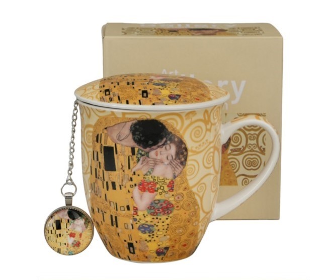 Taza con filtro de bola El Beso, cuadro de Klimt. Tapa de porcelana y filtro de acero inoxidable con medallón decorativo al final. Capacidad de 400ml. Caja regalo incluida.