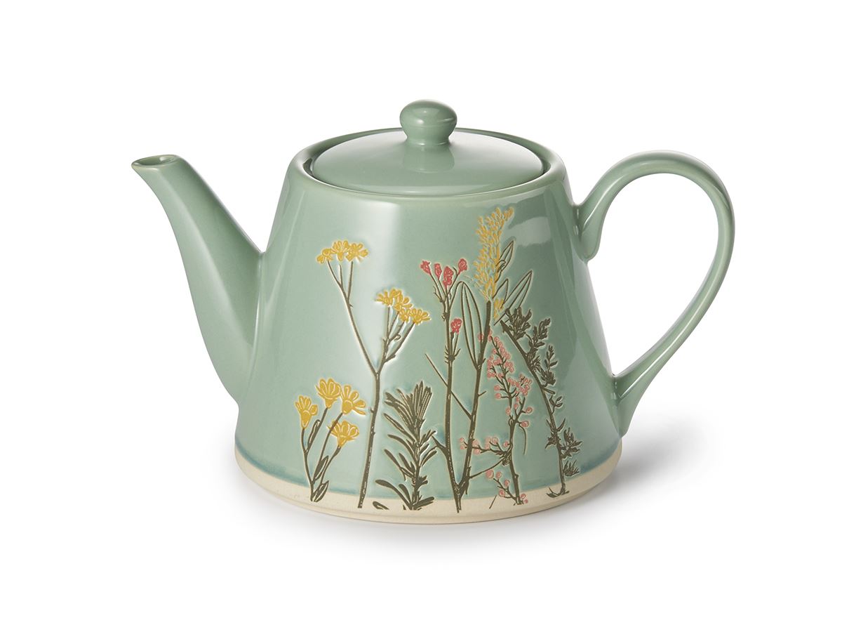 Tetera HINA 0.9L. De color verde pastel con decoración floral en relieve. Aptas para lavavajillas, aunque aconsejamos el lavado a mano. Accesorio de té disponible en nuestra tienda.